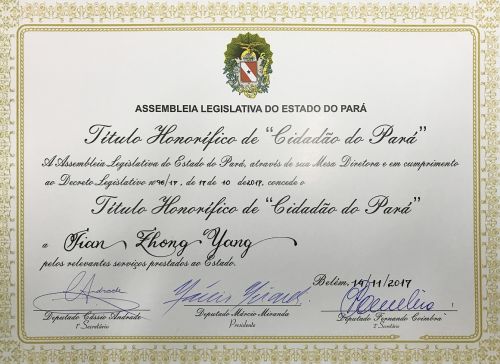 為表彰楊建忠董事長在巴西帕拉州經(jīng)濟社會發(fā)展和對外交流合作做出的貢獻,帕拉州議會于2017年10月17日通過立法大會第96條法令,授予他“帕拉州榮譽公民”稱號。2017年11 月 14 日,授予儀式在帕拉州議會大廳隆重舉行。