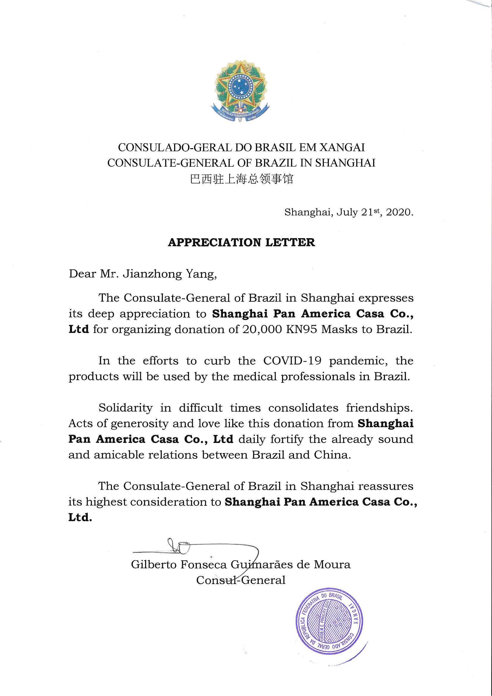 巴西駐滬總領(lǐng)事樂思哲與上海泛美家居有限公司董事長楊建忠先生、楊先生的家人以及企業(yè)代表們進(jìn)行了交談。儀式上,楊建忠董事長向總領(lǐng)事遞交了物資,總領(lǐng)事對捐贈人和企業(yè)的慷慨團(tuán)結(jié)之心表達(dá)了感謝,并現(xiàn)場頒發(fā)感謝信。